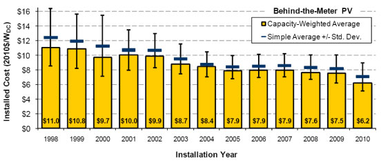 近日,美國能源部勞倫斯伯克利國家實(shí)驗(yàn)室發(fā)布《1998-2010年美國光伏系統(tǒng)裝機(jī)成本概述》。報(bào)告顯示,2010~2011年上半年,美國太陽能光伏發(fā)電系統(tǒng)裝機(jī)成本大幅降低。 報(bào)告考察了1998~2010年間美國42個(gè)州安裝的115000個(gè)住宅、商用和公共光伏系統(tǒng),占到全美并網(wǎng)光伏裝機(jī)容量的78%。數(shù)據(jù)顯示,2010年完成的住宅和商用太陽能光伏系統(tǒng)平均裝機(jī)成本比2009年下降了17%,2011年上半年又在此基礎(chǔ)上下降了11%。這一趨勢部分是由于光伏組件價(jià)格的大幅降低,光伏組件批發(fā)價(jià)格自2008年以來急劇下降,上游成本削減已傳導(dǎo)到用戶端。