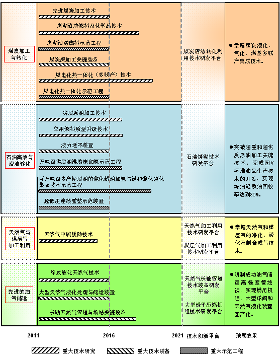 二是加工與轉(zhuǎn)化技術(shù)領(lǐng)域。我國能源消費結(jié)構(gòu)以煤炭為主,劣質(zhì)原油和劣質(zhì)天然氣占有較大比例,且產(chǎn)地遠離能源消費中心。為了充分利用資源,滿足能源高效轉(zhuǎn)換、多種供給、潔凈環(huán)保及遠途輸送的需求,提升能源產(chǎn)品綜合利用價值,需要開發(fā)先進的加工與轉(zhuǎn)化技術(shù)。《規(guī)劃》將“加工與轉(zhuǎn)化技術(shù)”作為第二項能源科技重點技術(shù)領(lǐng)域,確定了煤炭加工與轉(zhuǎn)化、石油高效與清潔轉(zhuǎn)化、天然氣與煤層氣加工利用和先進油氣輸運技術(shù)等4個能源應(yīng)用技術(shù)和工程示范重大專項,并按照“四位一體”的框架規(guī)劃了“十二五”期間能夠?qū)崿F(xiàn)產(chǎn)業(yè)化及未來10年有望取得突破的重點技術(shù)發(fā)展路線圖。