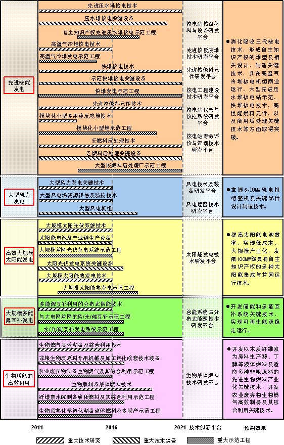 四是新能源技術(shù)領(lǐng)域。核能具有能量密集、成本低廉、溫室氣體排放少等優(yōu)點,風(fēng)能、太陽能、生物質(zhì)能和海洋能儲量巨大,發(fā)展核能發(fā)電、風(fēng)力發(fā)電、太陽能發(fā)電、生物質(zhì)能利用和海洋能發(fā)電等可再生能源技術(shù),規(guī)?;_發(fā)新能源,對優(yōu)化我國能源結(jié)構(gòu)、促進能源可持續(xù)發(fā)展具有重要意義?!兑?guī)劃》將“新能源技術(shù)”作為第四項能源科技重點技術(shù)領(lǐng)域,確定了先進核能發(fā)電技術(shù)、大型風(fēng)力發(fā)電技術(shù)、高效大規(guī)模太陽能發(fā)電技術(shù)、大規(guī)模多能源互補發(fā)電技術(shù)和生物質(zhì)能的高效利用技術(shù)等5個能源應(yīng)用技術(shù)和工程示范重大專項,并按照“四位一體”的框架規(guī)劃了“十二五”期間能夠?qū)崿F(xiàn)產(chǎn)業(yè)化及未來10年有望取得突破的重點技術(shù)發(fā)展路線圖。