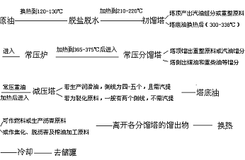 原油在煉油廠的加工工藝中首先要通過原油蒸餾。原油蒸餾分為常壓蒸餾、減壓蒸餾及常減壓蒸餾,選擇哪種方式主要取決于所加工原油的性質(zhì)和需要產(chǎn)品的情況。原油蒸餾裝置包括加熱爐、分餾塔、換熱器、冷凝和冷卻器等設(shè)備,原油的電脫鹽設(shè)備經(jīng)常附設(shè)在此裝置中。其常用生產(chǎn)工藝如下圖所示: