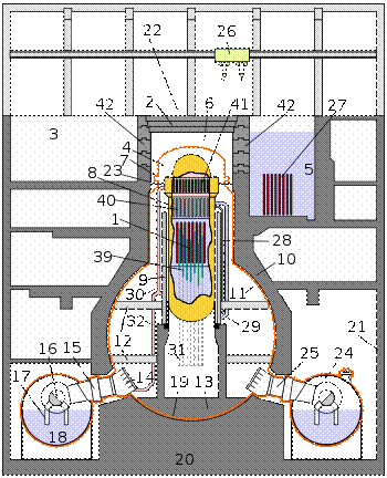 圖1.日本福島第一核電站1至5號機(jī)使用的典型沸水堆與馬克1型圍阻體截面圖(橘色曲線勾勒出一次圍阻體的輪廓,壓力控制池在底座周圍形成一個環(huán)形槽)。 1:堆芯、燃料棒 2:混凝土屏蔽塞(可開啟更換燃料) 5:乏燃料池 8:壓力容器 10:混凝土屏蔽墻 11:不銹鋼干井 13:埋置的混凝土 18:水(濕井) 19:外殼被埋置部分 20:底座 21:反應(yīng)堆建筑 22:燃料更換平臺 24:壓力控制池 25:排氣口 26:起重機(jī)(用于搬運(yùn)燃料棒及替換組件) 27:乏燃料 28:冷凝液管 29:從渦輪發(fā)電機(jī)組來的冷水管 30:往渦輪發(fā)電機(jī)組去的蒸氣管 39:反應(yīng)控制棒 31:反應(yīng)控制棒驅(qū)動(可調(diào)整反應(yīng)控制棒插入深度以調(diào)節(jié)反應(yīng)性) 20世紀(jì)60年代,通用電氣(GE)開始生產(chǎn)的加壓沸水反應(yīng)堆采用了馬克1型圍阻體,并使用了建造容易,尺寸較小、造價較為廉價的設(shè)計結(jié)構(gòu)。這種反應(yīng)堆稱為“馬克1型反應(yīng)堆”。上世紀(jì)80年代后期,通用電氣部分內(nèi)部文件曝光,內(nèi)容指稱馬克1型反應(yīng)堆未經(jīng)足夠測試,存有影響安全的設(shè)計瑕疵,導(dǎo)致數(shù)家公用事業(yè)公司、發(fā)電廠經(jīng)營者曾打算對通用電氣提告。由于當(dāng)時這種反應(yīng)堆在核能發(fā)電產(chǎn)業(yè)和監(jiān)管官員當(dāng)中的接受度頗高,最終美國核電廠并沒有停產(chǎn)“馬克1型反應(yīng)堆”,而是僅僅進(jìn)行了針對性的改造,增加了排氣系統(tǒng),以便在過熱的狀況下也能降壓。通用電氣的設(shè)計師未考慮極端自然災(zāi)害發(fā)生時的風(fēng)險,例如發(fā)生超強(qiáng)地震并伴隨海嘯。福島第一核電廠的6座反應(yīng)堆中,有5座是馬克1型反應(yīng)堆。在冷卻系統(tǒng)出現(xiàn)故障的情況下,馬克1型反應(yīng)堆經(jīng)不起爆炸和氫氣膨脹的帶來沖擊,最終不幸發(fā)生了堆芯熔毀的災(zāi)難性事故。 二是核島設(shè)備存在安全隱患 東京電力公司最近重新模擬了福島反應(yīng)堆冷卻系統(tǒng)功能停止后的事故現(xiàn)場。經(jīng)分析,該公司確定,當(dāng)時反應(yīng)堆外殼結(jié)構(gòu)的溫度至少為250℃,遠(yuǎn)遠(yuǎn)超過正常運(yùn)行的溫度60℃,而壓力也遠(yuǎn)遠(yuǎn)超出設(shè)計值。極高的溫度和壓力值似乎造成了福島核電站中的環(huán)氧樹脂密封貫穿件失靈,并導(dǎo)致易燃的氫氣泄漏。通常,環(huán)氧樹脂或橡膠用在核電站貫穿件密封部分或接口處,在高溫、高壓作用下,密封部分效用下降,導(dǎo)致氫氣泄漏(氫氣通過安全殼的貫穿件部分泄漏),從而引發(fā)系列爆炸和最終局面失控。電氣貫穿件是保障核島安全的重要安全裝置,在保證反應(yīng)堆安全殼結(jié)構(gòu)完整性的同時為安全殼內(nèi)的設(shè)備提供各種電氣通路,在反應(yīng)堆事故工況下,承受一定的壓力;密封技術(shù)是影響電氣貫穿件功效及其安全性的主要因素。核島電氣貫穿采用環(huán)氧樹脂密封的較多,70年代至80年代間美國核管理委員會(Nuclear Regulatory Commission)77-06號公告,IEB82-04公告,86-104和88-29號公告記錄過數(shù)起因貫穿件密閉性能減弱引發(fā)核島泄露的事故,但常規(guī)狀態(tài)下事故隱患容易被覺察和控制,因此沒有引發(fā)業(yè)界更多關(guān)注。東京電力公司對福島核泄漏事件的分析表明,核電站應(yīng)用安全保障設(shè)備的耐高溫性和抗壓性需考慮事故和突發(fā)事件下的承受力。鑒此,日本Hitachi GE計劃2012-2013年期間將下屬核電站的電氣貫穿使用的環(huán)氧樹脂封裝產(chǎn)品全部替換成耐溫和耐壓性能更好的無機(jī)材料封裝。