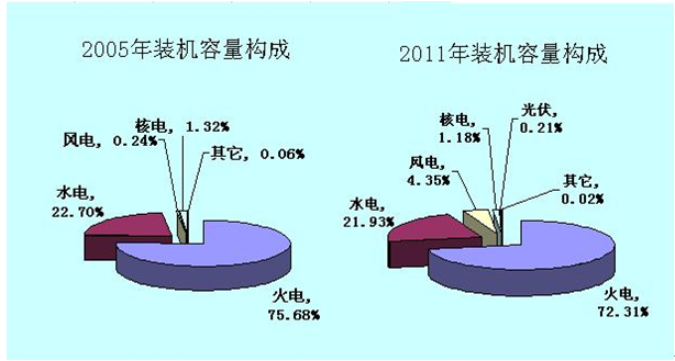 圖為2005年和2011年我國電力裝機容量構(gòu)成的對比。
