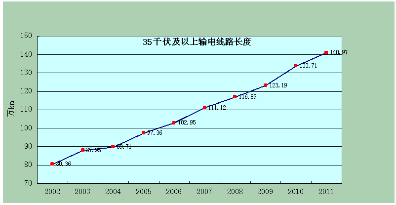 ????2011年,全國35千伏以上輸電線路達到141萬公里,其中220千伏及以上輸電線路長度達到48萬公里。?