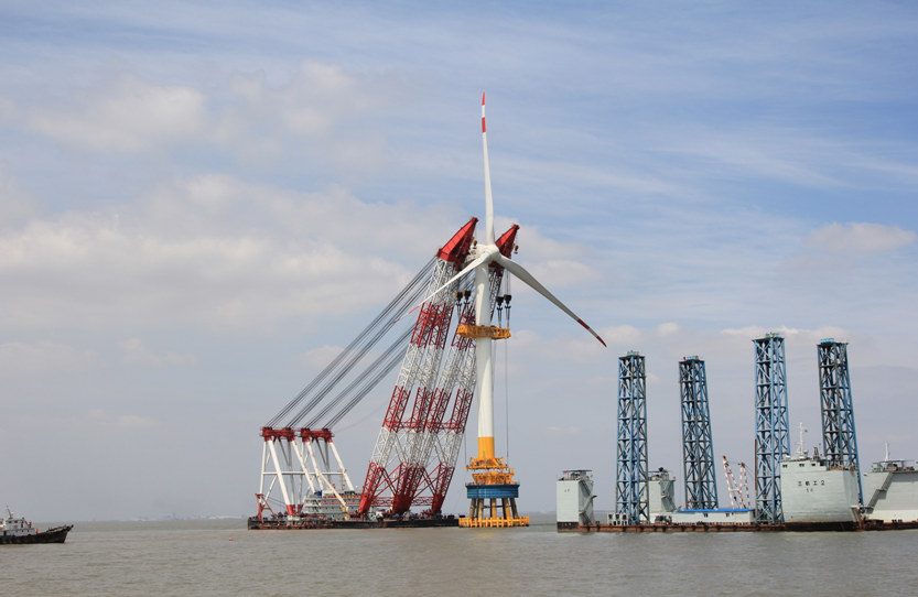 ????2011年,3兆瓦風(fēng)電機組批量生產(chǎn),5兆瓦風(fēng)電機組已經(jīng)下線。圖為我國自主制造的亞洲首臺3兆瓦海上風(fēng)電機組在上海東海大橋吊裝成功。? |