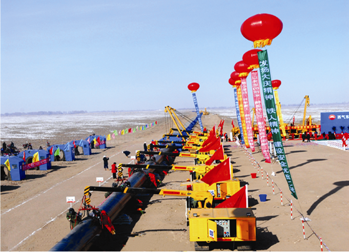 ???西氣東輸一線干線全長3840公里,目前全線輸氣能力達170億立方米/年,向河南、安徽、江蘇、浙江和上海供氣。西氣東輸二線是我國第一條引進境外天然氣資源的特大型管道工程,與中亞天然氣管道A、B線相連接,包括一干和八支干線,全長8704公里,設(shè)計輸氣能力300億立方米/年,途經(jīng)新疆等14個?。▍^(qū)、市)和香港特別行政區(qū),計劃2012年底累計接輸中亞天然氣將超過400億立方米。西氣東輸三線2012年10月開工建設(shè)。圖為西氣東輸二線開工。 |