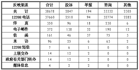 ????為了保護(hù)電力投資者、經(jīng)營者、使用者的合法權(quán)益,維護(hù)能源市場秩序,依法履行職責(zé),國家能源局積極暢通投訴舉報渠道,切實發(fā)揮全國范圍內(nèi)12398(含12398電話、傳真、電子郵件等)投訴舉報的作用,認(rèn)真處理人民群眾對違法違規(guī)行為的投訴舉報,定期公布能源監(jiān)管機構(gòu)對投訴舉報的處理情況?,F(xiàn)將2013年度12398投訴舉報處理情況通報如下: ????一、基本情況 ????(一)受理情況 ????2013年,共收到12398投訴舉報有效信息38678件,同比增長36.80%。 ????按訴求性質(zhì)分類:投訴2847件,占有效信息的7.36%,同比增加284件;舉報194件,占有效信息的0.50%,同比減少36件;咨詢33332件,占有效信息的86.18%,同比增加10608件;表揚、求助、建議等其他方面2305件,占有效信息的5.96%,同比減少452件。 ????按反映渠道分類:12398電話37660件,傳真350件,電子郵件372件,信函161件,來訪96件,短信7件,上級交辦14件,政府有關(guān)部門轉(zhuǎn)辦14件,媒體信息4件。(2013年投訴舉報受理情況見表一) 表一 2013年投訴舉報受理情況 單位:件
