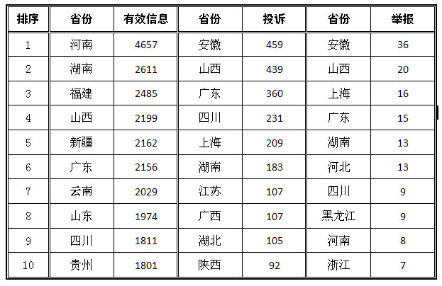 ?????(四)區(qū)域分布情況 ????2013年,從能源監(jiān)管機構(gòu)收到的12398有效信息來看,河南、湖南、福建、山西、新疆排在全國前5位;從投訴數(shù)量來看,安徽、山西、廣東、四川、上海排在全國前5位;從舉報數(shù)量看,安徽、山西、上海、廣東、湖南排在全國前5位。(2013年有效信息及投訴、舉報數(shù)量排名前10位省份情況見表三) 表三 2013年有效信息及投訴、舉報數(shù)量排名前10位省份情況 單位:件