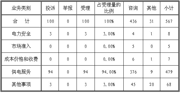 ????為了保護(hù)電力投資者、經(jīng)營(yíng)者、使用者的合法權(quán)益,維護(hù)能源市場(chǎng)秩序,依法履行職責(zé),國(guó)家能源局積極暢通投訴舉報(bào)渠道,切實(shí)發(fā)揮全國(guó)范圍內(nèi)12398(含12398電話、傳真、電子郵件等)投訴舉報(bào)的作用,認(rèn)真處理人民群眾對(duì)違法違規(guī)行為的投訴舉報(bào),定期公布能源監(jiān)管機(jī)構(gòu)對(duì)投訴舉報(bào)的處理情況?,F(xiàn)將2014年春節(jié)期間12398投訴舉報(bào)處理情況通報(bào)如下: ????一、基本情況 ????(一)受理情況 ????2014年春節(jié)期間,共收到12398投訴舉報(bào)有效信息567件,同比減少14.86%。 ????按訴求性質(zhì)分類:投訴100件,占有效信息的17.64%,同比減少16件;舉報(bào)0件,同比減少2件;咨詢436件,占有效信息的76.90%,同比減少95件;表?yè)P(yáng)、求助、建議等其他方面31件,占有效信息的5.46%,同比增加12件。 ????(二)辦理情況 ????根據(jù)國(guó)家有關(guān)法律法規(guī)規(guī)定,對(duì)2014年春節(jié)期間收到的100件投訴舉報(bào)全部進(jìn)行了受理。截止到2014年2月6日,已辦理完畢75件,占投訴舉報(bào)受理量的75.00%。 ????(三)業(yè)務(wù)分類情況 ????2014年春節(jié)期間,能源監(jiān)管機(jī)構(gòu)收到的567件有效信息中,供電服務(wù)479件,成本價(jià)格和收費(fèi)7件,市場(chǎng)準(zhǔn)入5件,電力安全8件,其他事項(xiàng)68件。 ????從收到的投訴舉報(bào)情況看,供電服務(wù)方面的最多,共94件,占投訴舉報(bào)的94.00%;其次是電力安全和其他事項(xiàng)方面,各3件,各占投訴舉報(bào)的3.00%。(2014年春節(jié)期間投訴舉報(bào)業(yè)務(wù)分類情況見表一) 表一 2014年春節(jié)期間投訴舉報(bào)業(yè)務(wù)分類情況 ????單位:件