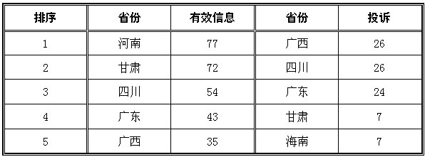 ????(四)區(qū)域分布情況 ????2014年春節(jié)期間,從能源監(jiān)管機(jī)構(gòu)收到的12398有效信息來(lái)看,河南、甘肅、四川、廣東、廣西排在全國(guó)前5位;從投訴數(shù)量來(lái)看,廣西、四川、廣東、甘肅、海南排在全國(guó)前5位;春節(jié)期間全國(guó)沒有發(fā)生舉報(bào)事項(xiàng)。(2014年有效信息及投訴數(shù)量排名前5位省份情況見表二) 表二 2014年有效信息及投訴數(shù)量排名前5位省份情況 ????單位:件