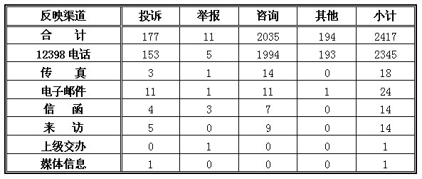 ????為了保護電力投資者、經(jīng)營者、使用者的合法權(quán)益,維護能源市場秩序,依法履行監(jiān)管職責(zé),國家能源局積極暢通投訴舉報渠道,切實發(fā)揮全國范圍內(nèi)12398(含12398電話、傳真、電子郵件等)電力投訴舉報熱線的作用,認(rèn)真受理電力投訴舉報,定期公布能源監(jiān)管機構(gòu)對電力投訴舉報的處理情況。現(xiàn)將2014年1月份12398電力投訴舉報處理情況通報如下: ????一、基本情況 ????(一)受理情況 ????2014年1月,共收到12398電力投訴舉報有效信息2417件,環(huán)比下降18.87%。 ????按訴求性質(zhì)分類:投訴177件,占有效信息的7.32%,環(huán)比減少4件;舉報11件,占有效信息的0.46%,環(huán)比減少6件;咨詢2035件,占有效信息的84.20%,環(huán)比減少528件;表揚、求助、建議等其他方面194件,占有效信息的8.03%,環(huán)比減少24件。 ????按反映渠道分類:12398電話2345件,傳真18件,電子郵件24件,信函14件,來訪14件,上級交辦1件,媒體信息1件。(2014年1月投訴舉報受理情況見表一) 表一 2014年1月投訴舉報受理情況 單位:件