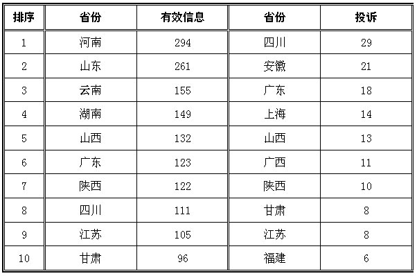 ????(四)區(qū)域分布情況 ????2014年1月,從能源監(jiān)管機構(gòu)收到的12398電力投訴舉報有效信息來看,河南、山東、云南、湖南、山西排在全國前5位;從投訴數(shù)量來看,四川、安徽、廣東、上海、山西排在全國前5位。(2014年1月有效信息及投訴排名前10位省份情況見表三) 表三 2014年1月有效信息與投訴排名前10位省份情況 單位:件