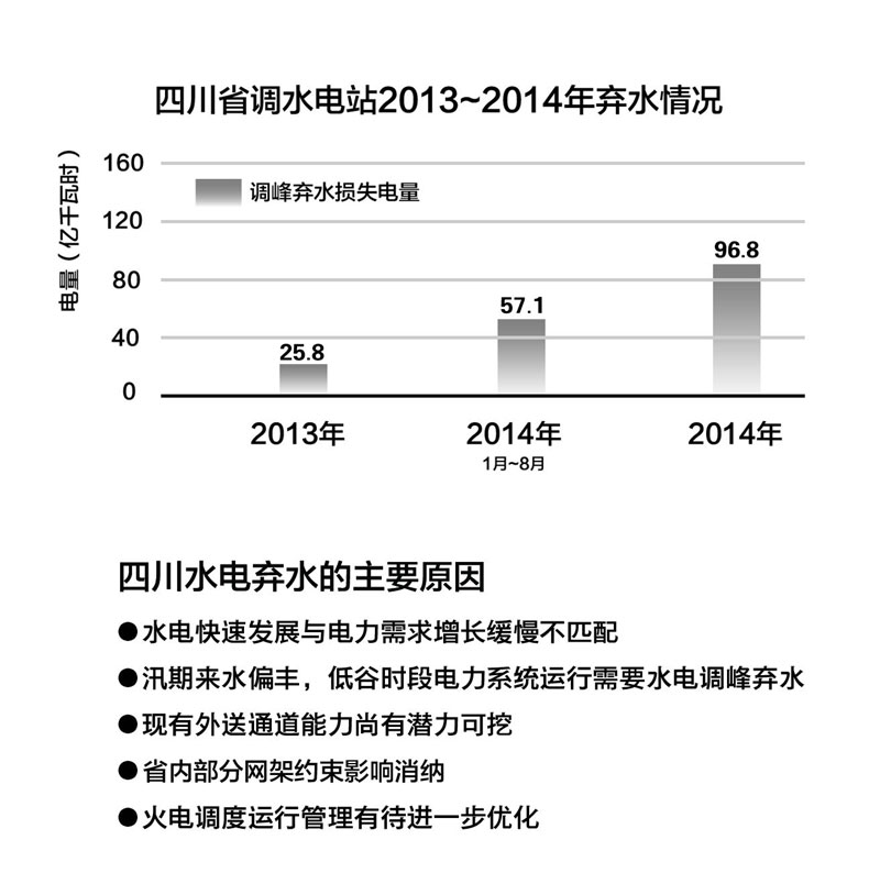 國家能源局發(fā)布的《水電基地棄水問題駐點四川監(jiān)管報告》顯示 五大主因致四川水電棄水 2014年調(diào)峰棄水電量96.8億千瓦時 ????我國水電發(fā)電量去年歷史性突破1萬億千瓦時,為能源供給增添了一抹綠色。然而,欣喜之余,我們難以隱忍棄水之殤。 ????國家能源局日前發(fā)布的《水電基地棄水問題駐點四川監(jiān)管報告》(以下簡稱《報告》)披露,2014年四川調(diào)峰棄水電量達96.8億千瓦時,占豐水期水電發(fā)電量的14.93%。 ????《報告》根據(jù)工作組駐點四川監(jiān)管情況,深入分析了導(dǎo)致水電棄水的5大主因,并就突出問題提出了監(jiān)管建議。 ????(一)水電快速發(fā)展、電力需求增長緩慢,四川水電棄水壓力山大 ????近兩年,伴隨著我國加快轉(zhuǎn)變電力發(fā)展方式,著力推進電力結(jié)構(gòu)優(yōu)化和產(chǎn)業(yè)升級,四川水電呈現(xiàn)集中投產(chǎn)態(tài)勢,與之相對應(yīng)的水電消納和棄水相伴相生。 ????一方面,水電集中投產(chǎn)?!笆濉逼陂g,四川每年有1000萬千瓦以上水電裝機增長,至2014年9月底,其水電裝機達6028萬千瓦,占全省總裝機比例由2013年的76.74%上升到79.4%。 ????另一方面,省內(nèi)、省外消納市場持續(xù)低迷。四川省內(nèi)售電量增速已由“十二五”初的16.4%下降到3.4%。而華中、華東區(qū)域電力供需寬松,外購電意愿不強。 ????《報告》指出,盡管四川省政府及各電力企業(yè)積極作為,給政策、強電網(wǎng),力促水電消納,但四川水電棄水情況依然存在。 ????據(jù)核查統(tǒng)計,2014年1-8月四川省調(diào)(不含國調(diào)廠)水電站共產(chǎn)生調(diào)峰棄水損失電量57.1億千瓦時(含調(diào)峰、檢修等正常棄水),較2013年有所增長(如圖所示)。