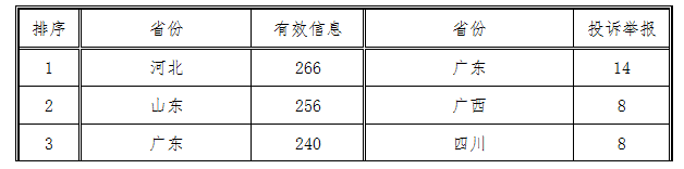 ????各省(自治區(qū)、直轄市)按照收到的有效信息數(shù)量排序,河北、山東、廣東列全國前3位;按照投訴舉報數(shù)量排序,廣東、廣西、四川列全國前3位。(2016年5月有效信息及投訴舉報排名前3位情況見表三)