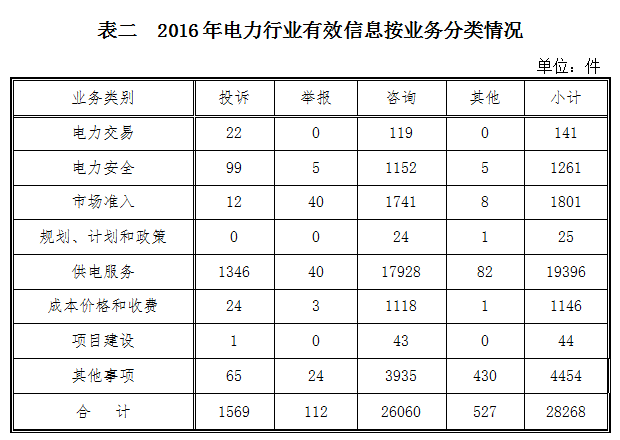 ????(二)分類情況 ????2016年,12398熱線收到的有效信息中,電力行業(yè)類28271件,占86.07%;新能源和可再生能源行業(yè)類903件,占2.75%;石油天然氣行業(yè)類741件,占2.26%;煤炭行業(yè)類11件,占0.03%;其他事項2919件,占8.89%。 ????投訴舉報主要集中在電力行業(yè),共1681件。從業(yè)務分類情況看,供電服務方面1386件,占82.45%;電力安全方面104件,占6.19%;市場準入方面52件,占3.09%;成本價格和收費27件,占1.61%;電力交易方面22件,占1.31%;項目建設方面1件,占0.06%;其他事項89件,占5.29%。(2016年電力行業(yè)有效信息按業(yè)務分類情況見表二)