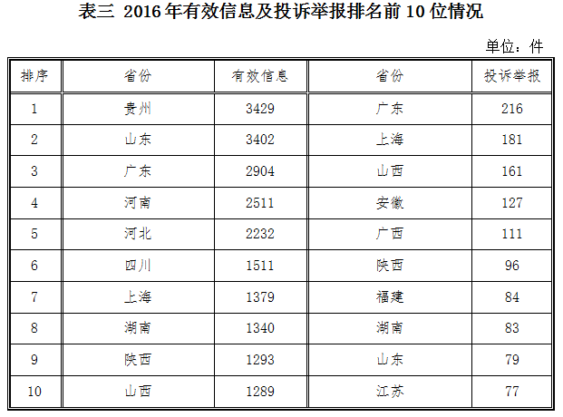 ????(三)區(qū)域分布情況 ????各?。ㄗ灾螀^(qū)、直轄市)按照收到的有效信息數量排序,貴州省、山東省、廣東省、河南省、河北省列全國前5位;按照投訴舉報數量排序,廣東省、上海市、山西省、安徽省、廣西自治區(qū)排在全國前5位。(2016年有效信息及投訴舉報排名前10位情況見表三)