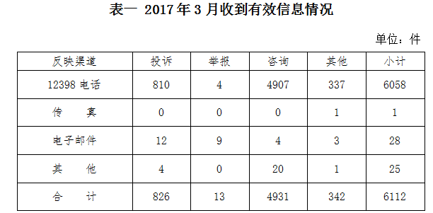????為了保護(hù)能源投資者、經(jīng)營者、使用者的合法權(quán)益,維護(hù)能源市場秩序,依法履行監(jiān)管職責(zé),國家能源局積極暢通投訴舉報渠道,切實發(fā)揮12398(含12398電話、傳真、電子郵件等)能源監(jiān)管投訴舉報熱線的作用,認(rèn)真受理能源監(jiān)管投訴舉報事項,定期公布投訴舉報處理情況?,F(xiàn)將2017年3月份12398能源監(jiān)管投訴舉報處理情況通報如下: ????一、基本情況 ????(一)收到有效信息情況 ????2017年3月,國家能源局12398能源監(jiān)管熱線(以下簡稱12398熱線)共收到有效信息6112件,環(huán)比增加50.06%,同比增加106.77%。 ????按訴求性質(zhì)分類,投訴826件,占有效信息的13.51%;舉報13件,占有效信息的0.21%;咨詢4931件,占有效信息的80.68%;表揚、求助、建議等其他方面342件,占有效信息的5.60%。 ????按反映渠道分類,12398電話6058件,傳真1件,電子郵件28件,其他25件。(2017年3月收到有效信息情況見表一)