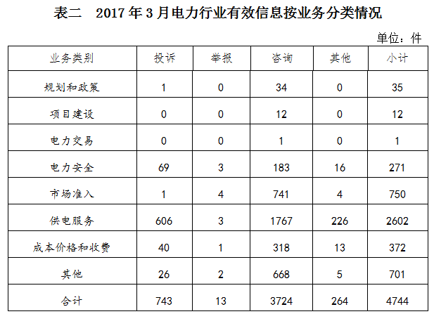 ????(二)分類情況 ????2017年3月收到的有效信息中,電力行業(yè)類4744件,占77.62%;新能源和可再生能源行業(yè)類592件,占9.69%;石油天然氣行業(yè)類80件,占1.31%;煤炭行業(yè)類6件,占0.10%;其他事項690件,占11.28%。 ????投訴舉報主要集中在電力行業(yè),共756件。從業(yè)務(wù)分類情況看,規(guī)劃和政策方面1件,占0.13%;電力安全方面72件,占9.53%;市場準(zhǔn)入方面5件,占0.66%;供電服務(wù)方面609件,占80.56%;成本價格和收費方面41件,占5.42%;其他方面28件,占3.70%。(2017年3月電力行業(yè)有效信息按業(yè)務(wù)分類情況見表二)。