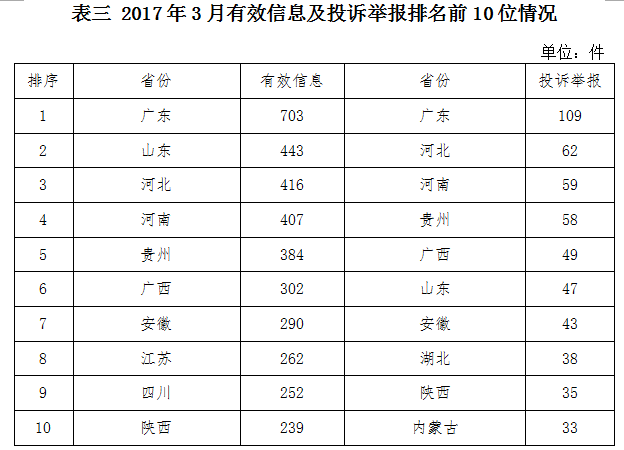 ????(三)區(qū)域分布情況 ????各?。ㄗ灾螀^(qū)、直轄市)按照收到的有效信息數(shù)量排序,廣東、山東、河北、河南、貴州、廣西、安徽、江蘇、四川、陜西列全國前10位;按照投訴舉報數(shù)量排序,廣東、河北、河南、貴州、廣西、山東、安徽、湖北、陜西、內(nèi)蒙古排在全國前10位。(2017年3月有效信息及投訴舉報排名前10位情況見表三)