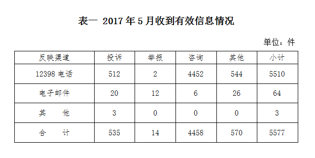 ????為了保護(hù)能源投資者、經(jīng)營者、使用者的合法權(quán)益,維護(hù)能源市場秩序,依法履行監(jiān)管職責(zé),國家能源局積極暢通投訴舉報渠道,切實發(fā)揮12398(含12398電話、傳真、電子郵件等)能源監(jiān)管熱線的作用,認(rèn)真受理能源監(jiān)管投訴舉報事項,定期公布投訴舉報處理情況?,F(xiàn)將2017年5月份12398能源監(jiān)管熱線(以下簡稱12398熱線)投訴舉報處理情況通報如下: ????一、基本情況 ????(一)收到有效信息情況 ????2017年5月,國家能源局12398熱線共收到有效信息5577件,環(huán)比增加14.05%。 ????按訴求性質(zhì)分類,投訴535件,占有效信息的9.59%;舉報14件,占有效信息的0.25%;咨詢4458件,占有效信息的79.94%;表揚、求助、建議等其他方面570件,占有效信息的10.22%。 ????按反映渠道分類,12398電話5510件,電子郵件64件,其他3件。(2017年5月收到有效信息情況見表一)