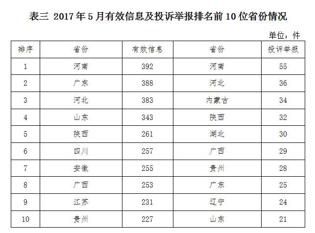 ????(三)區(qū)域分布情況 ????各省(自治區(qū)、直轄市)按照收到的有效信息數(shù)量排序,河南、廣東、河北、山東、陜西、四川、安徽、廣西、江蘇、貴州列全國前10位;按照投訴舉報數(shù)量排序,河南、河北、內(nèi)蒙古、陜西、湖北、廣西、貴州、廣東、遼寧、山東排在全國前10位。(2017年5月有效信息及投訴舉報排名前10位省份情況見表三)