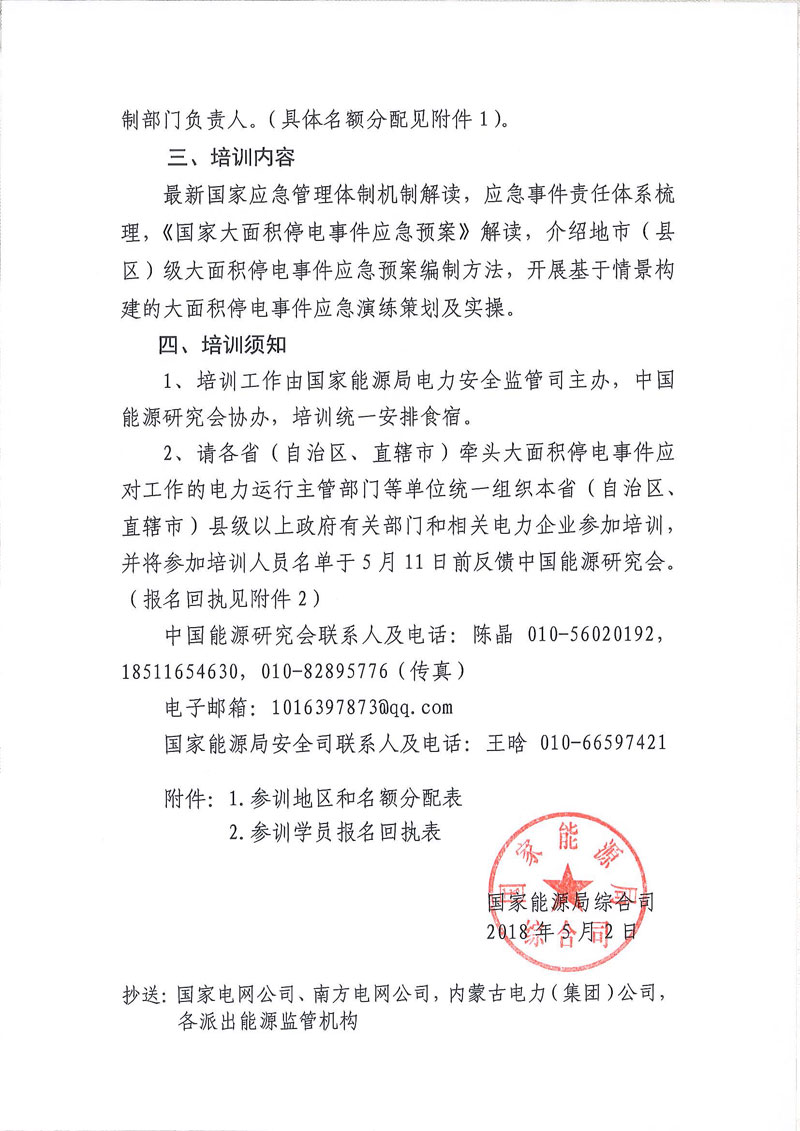 國家能源局綜合司關于開展2018年地市(縣區(qū))級大面積停電事件應急預案編制培訓工作的通知