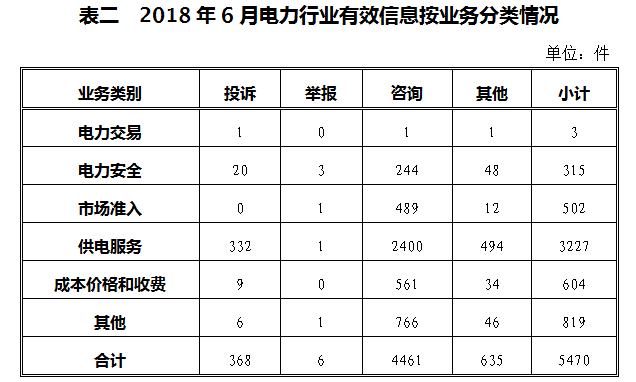 ????二、分類情況 ????2018年6月收到的有效信息中,電力行業(yè)類5470件,占63.33%;新能源和可再生能源行業(yè)類2400件,占27.79%;石油天然氣行業(yè)類158件,占1.83%;煤炭行業(yè)類7件,占0.08%;其他事項(xiàng)602件,占6.97%。收到的投訴舉報(bào)中,電力行業(yè)類374件,占89.90%,新能源和可再生能源行業(yè)類共41件,占9.86%,其他領(lǐng)域1件,占0.24%。電力行業(yè)的投訴舉報(bào)中,供電服務(wù)方面333件,占89.04%;電力安全方面23件,占6.15%;成本價(jià)格和收費(fèi)方面9件,占2.40%;電力交易、市場(chǎng)準(zhǔn)入方面各1件,占0.27%;其他方面7件,占1.87%。(2018年6月電力行業(yè)有效信息按業(yè)務(wù)分類情況見表二)。