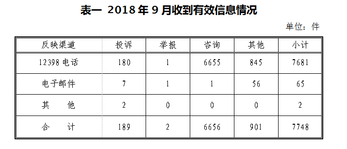 ??? 一、基本情況 ????2018年9月,國(guó)家能源局12398熱線共收到有效信息7748件,環(huán)比減少32.65%,同比增加28.38%;其中投訴舉報(bào)191件,環(huán)比減少65.95%,同比減少50.39%。 ????按訴求性質(zhì)分類,投訴189件,占有效信息的2.44%;舉報(bào)2件,占有效信息的0.02%;咨詢6656件,占有效信息的85.91%;表?yè)P(yáng)、求助、建議等其他方面901件,占有效信息的11.63%。 ????按反映渠道分類,12398電話7681件,電子郵件65件,其他2件。(2018年9月收到有效信息情況見(jiàn)表一)