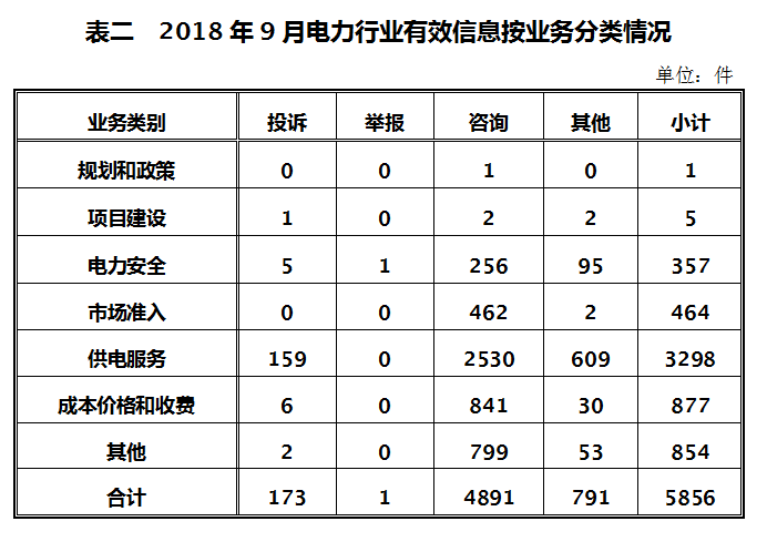 ????二、分類情況 ????2018年9月收到的有效信息中,電力行業(yè)類5856件,占75.58%;新能源和可再生能源行業(yè)類844件,占10.89%;石油天然氣行業(yè)類208件,占2.69%;煤炭行業(yè)類6件,占0.08%;其他事項(xiàng)834件,占10.76%。 ????投訴舉報(bào)主要集中在電力行業(yè),共174件。從業(yè)務(wù)分類情況看,項(xiàng)目建設(shè)方面1件,占0.57%;電力安全方面6件,占3.45%;供電服務(wù)方面159件,占91.38%;成本價(jià)格和收費(fèi)方面6件,占3.45%;其他方面2件,占1.15%。(2018年9月電力行業(yè)有效信息按業(yè)務(wù)分類情況見(jiàn)表二)。