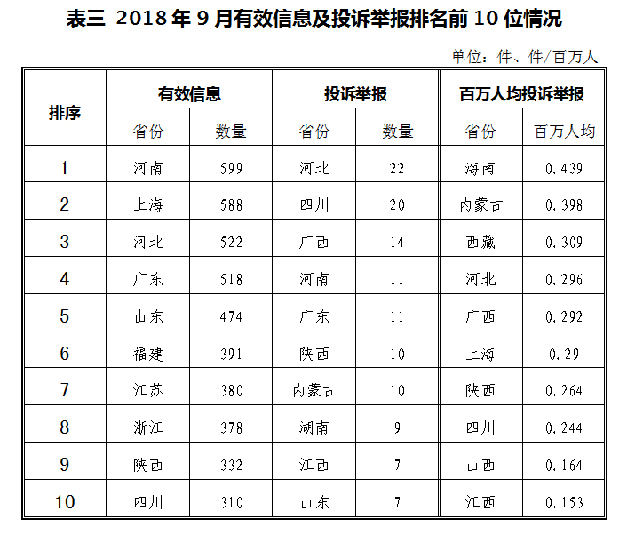 ????三、分布情況 ????各省(自治區(qū)、直轄市)按照收到的有效信息數(shù)量排序,河南、上海、河北、廣東、山東等列全國(guó)前10位;按照投訴舉報(bào)數(shù)量排序,河北、四川、廣西、河南、廣東等排在全國(guó)前10位。按照百萬(wàn)人均投訴舉報(bào)數(shù)量排序,海南,內(nèi)蒙古,西藏,河北,廣西等排在全國(guó)前10位。(2018年9月有效信息及投訴舉報(bào)排名前10位情況見(jiàn)表三)
