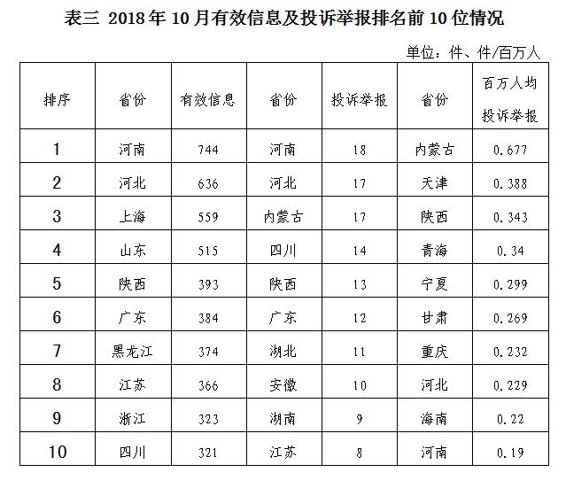 三、分布情況 各?。ㄗ灾螀^(qū)、直轄市)按照收到的有效信息數(shù)量排序,河南、河北、上海、山東、陜西等排在全國(guó)前10位;按照投訴舉報(bào)數(shù)量排序,河南、河北、內(nèi)蒙古、四川、陜西等排在全國(guó)前10位。按照百萬(wàn)人均投訴舉報(bào)數(shù)量排序,內(nèi)蒙古、天津、陜西、青海、寧夏等排在全國(guó)前10位。(2018年10月有效信息及投訴舉報(bào)排名前10位情況見(jiàn)表三)?