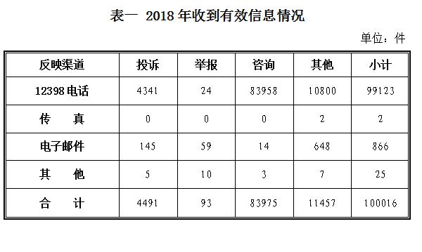 ????一、基本情況 ????2018年,國(guó)家能源局12398能源監(jiān)管熱線共收到有效信息100016件,同比增加39.9%。 ????按訴求性質(zhì)分類,投訴4491件,占有效信息的4.49%;舉報(bào)93件,占有效信息的0.09%;咨詢83975件,占有效信息的83.96%;表揚(yáng)、求助、建議等其他方面11457件,占有效信息的11.46%。 ????按反映渠道分類,12398電話99123件,傳真2件,電子郵件866件,其他25件。(2018年收到有效信息情況見表一)