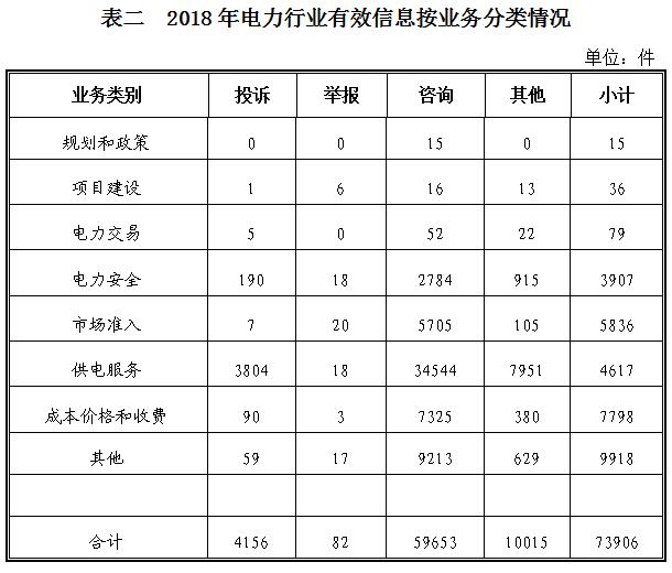 ????二、分類情況 ????2018年收到的有效信息中,電力行業(yè)類73906件,占73.89%;新能源和可再生能源行業(yè)類13764件,占13.76%;石油天然氣行業(yè)類2887件,占2.89%;煤炭行業(yè)類74件,占0.07%;其他事項(xiàng)9385件,占9.38%。 ????投訴舉報(bào)主要集中在電力行業(yè),共4238件。從業(yè)務(wù)分類情況看,項(xiàng)目建設(shè)方面7件,占0.17%;電力交易方面5件,占0.12%;電力安全方面208件,占4.91%;市場(chǎng)準(zhǔn)入方面27件,占0.64%;供電服務(wù)方面3822件,占90.18%;成本價(jià)格和收費(fèi)方面93件,占2.19%;其他方面76件,占1.79%。(2018年電力行業(yè)有效信息按業(yè)務(wù)分類情況見表二)。