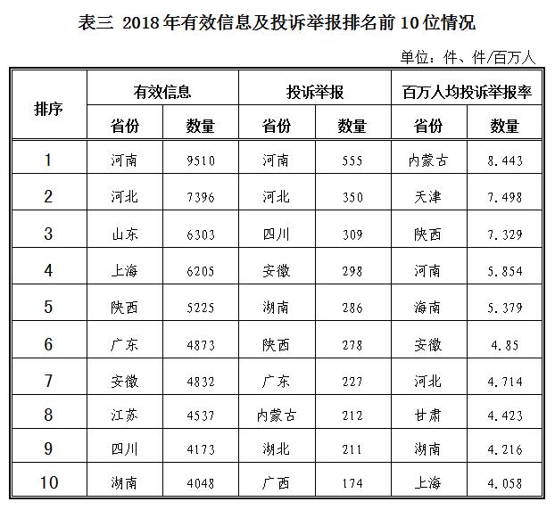 ????三、分布情況 ????各?。ㄗ灾螀^(qū)、直轄市)按照收到的有效信息數(shù)量排序,河南、河北、山東、上海、陜西、廣東、安徽、江蘇、四川、湖南列全國(guó)前10位;按照投訴舉報(bào)數(shù)量排序,河南、河北、四川、安徽、湖南、陜西、廣東、內(nèi)蒙古、湖北、廣西排在全國(guó)前10位。 ????按照百萬人均投訴舉報(bào)數(shù)量排序,內(nèi)蒙古,天津,陜西,河南,海南等排在全國(guó)前10位。(2018年有效信息及投訴舉報(bào)排名前10位情況見表三)