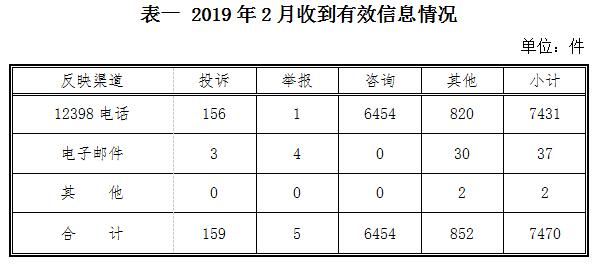 ????一、基本情況 ????2019年2月,國(guó)家能源局12398熱線共收到有效信息7470件,環(huán)比減少15.45%,同比增加18.36%。 ????按訴求性質(zhì)分類(lèi),投訴159件,占有效信息的2.13%;舉報(bào)5件,占有效信息的0.07%;咨詢(xún)6454件,占有效信息的86.40%;表?yè)P(yáng)、求助、建議等其他方面852件,占有效信息的11.40%。 ????按反映渠道分類(lèi),12398電話7431件,電子郵件37件,其他2件。(2019年2月收到有效信息情況見(jiàn)表一)