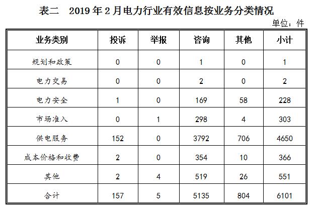 ????二、分類(lèi)情況 ????2019年2月收到的有效信息中,電力行業(yè)類(lèi)6073件,占81.30%;新能源和可再生能源行業(yè)類(lèi)380件,占5.09%;石油天然氣行業(yè)類(lèi)204件,占2.73%;煤炭行業(yè)類(lèi)2件,占0.03%;其他事項(xiàng)811件,占10.85%。 ????投訴舉報(bào)主要集中在電力行業(yè),共162件。從業(yè)務(wù)分類(lèi)情況看,電力安全方面1件,占0.62%;市場(chǎng)準(zhǔn)入方面1件,占0.62%;供電服務(wù)方面152件,占93.83%;成本價(jià)格和收費(fèi)方面2件,占1.23%;其他方面6件,占3.70%。(2019年2月電力行業(yè)有效信息按業(yè)務(wù)分類(lèi)情況見(jiàn)表二)。