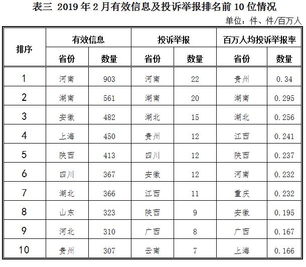 ????三、分布情況 ????各省(自治區(qū)、直轄市)按照收到的有效信息數(shù)量排序,河南、湖南、安徽、上海、陜西等列全國(guó)前10位;按照投訴舉報(bào)數(shù)量排序,河南、湖南、湖北、貴州、四川等排在全國(guó)前10位。按照百萬(wàn)人均投訴舉報(bào)數(shù)量排序,貴州、湖南、湖北、江西、陜西等排在全國(guó)前10位。(2019年2月有效信息及投訴舉報(bào)排名前10位情況見(jiàn)表三)