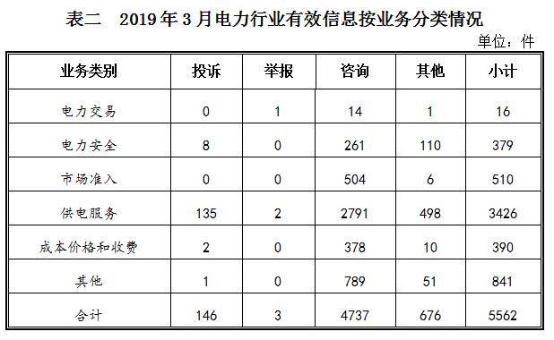 ????二、分類情況 ????2019年3月收到的有效信息中,電力行業(yè)類5562件,占78.98%;新能源和可再生能源行業(yè)類565件,占8.02%;石油天然氣行業(yè)類233件,占3.31%;煤炭行業(yè)類6件,占0.09%;其他事項676件,占9.60%。 ????投訴舉報主要集中在電力行業(yè),共149件。從業(yè)務分類情況看,電力交易方面1件,占0.67%;電力安全方面8件,占5.37%;供電服務方面137件,占91.95%;成本價格和收費方面2件,占1.34%;其他方面1件,占0.67%。(2019年3月電力行業(yè)有效信息按業(yè)務分類情況見表二)。