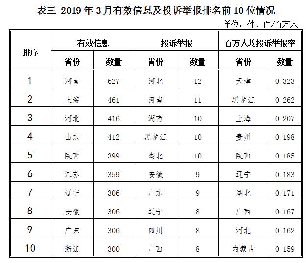 ????三、分布情況 ????各?。ㄗ灾螀^(qū)、直轄市)按照收到的有效信息數(shù)量排序,河南、上海、河北、山東、陜西等列全國前10位;按照投訴舉報數(shù)量排序,河北、河南、湖南、黑龍江、湖北等排在全國前10位。按照百萬人均投訴舉報數(shù)量排序,天津、黑龍江、上海、貴州、陜西等排在全國前10位。(2019年3月有效信息及投訴舉報排名前10位情況見表三)