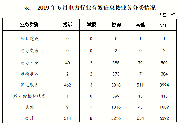 二、分類情況 按行業(yè)分類2019年6月收到的有效信息中: 電力行業(yè)排在首位,有效信息數(shù)量為6392件,占全部有效信息的80.33%;其中受理的投訴舉報(bào)數(shù)量為522件,占全部投訴舉報(bào)數(shù)量的93.38%。群眾反映的問題主要集中在供電服務(wù)、電力安全、成本價(jià)格和收費(fèi)等方面。(2019年6月電力行業(yè)有效信息按業(yè)務(wù)分類情況見表二) 新能源和可再生能源行業(yè)排在第二位,有效信息數(shù)量為793件,占全部有效信息的9.97%;其中受理的投訴舉報(bào)數(shù)量為37件,占全部投訴舉報(bào)數(shù)量的6.62%。群眾反映的問題主要集中在分布式光伏發(fā)電項(xiàng)目并網(wǎng)、上網(wǎng)電費(fèi)結(jié)算、發(fā)電量補(bǔ)貼轉(zhuǎn)付等方面。 石油天然氣行業(yè)排在第三位,有效信息數(shù)量為260件,占全部有效信息的3.27%。有效信息主要集中于加油站服務(wù)、燃?xì)夤艿栏脑?、燃?xì)獍惭b等問題。 其他有效信息合計(jì)512件,占6.43%,其中涉及煤炭行業(yè)的主要以咨詢有關(guān)項(xiàng)目審批等問題為主。