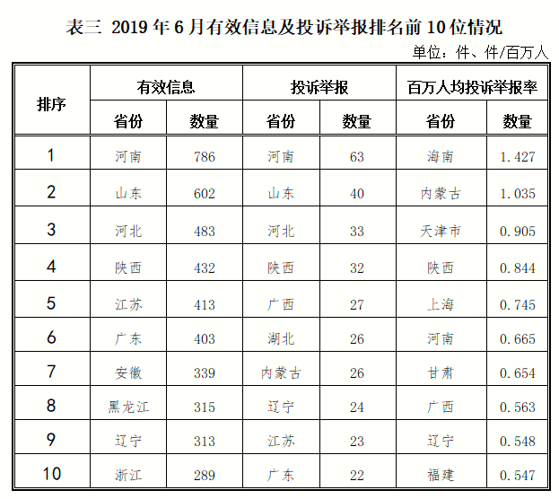 三、分布情況 各?。ㄗ灾螀^(qū)、直轄市)按照收到的有效信息數(shù)量排序,河南、山東、河北、陜西、江蘇等列全國前10位;按照投訴舉報(bào)數(shù)量排序,河南、山東、河北、陜西、廣西等排在全國前10位。按照百萬人均投訴舉報(bào)數(shù)量排序,海南、內(nèi)蒙古、天津、陜西、上海等排在全國前10位。(2019年6月有效信息及投訴舉報(bào)排名前10位情況見表三)