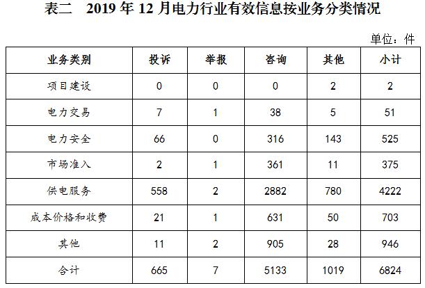 二、分類情況 2019年12月收到的有效信息中: 電力行業(yè)排在首位,有效信息數(shù)量為6824件,占全部有效信息的81.05%;其中受理的投訴舉報數(shù)量為672件,占全部投訴舉報數(shù)量的97.39%。群眾反映的問題主要集中在供電服務、電力安全、成本價格和收費等方面。(2019年11月電力行業(yè)有效信息按業(yè)務分類情況見表二) 新能源和可再生能源行業(yè)排在第二位,有效信息數(shù)量為670件,占全部有效信息的7.96%;其中受理的投訴舉報數(shù)量為18件,占全部投訴舉報數(shù)量的2.61%。群眾反映的問題主要集中在分布式光伏發(fā)電項目并網(wǎng)驗收、上網(wǎng)電費和補貼結算等方面。 石油天然氣行業(yè)排在第三位,有效信息數(shù)量為371件,占全部有效信息的4.41%。有效信息主要集中于咨詢居民燃氣安裝及收費、查詢天然氣行業(yè)標準、反映燃氣使用故障等方面。 其他有效信息合計554件,占全部有效信息的6.58%。其中涉及煤炭行業(yè)的主要內(nèi)容是咨詢煤炭相關產(chǎn)業(yè)政策和文件信息、查詢煤礦項目的審批進度等方面。