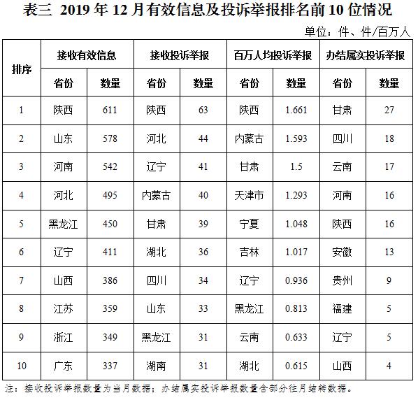 三、分布情況 各省(自治區(qū)、直轄市)按照收到的有效信息數(shù)量排序,陜西、山東、河南、河北、黑龍江等列全國前10位;按照投訴舉報數(shù)量排序,陜西、河北、遼寧、內(nèi)蒙古、甘肅等排在全國前10位;按照百萬人均投訴舉報數(shù)量排序,陜西,內(nèi)蒙古,甘肅,天津市,寧夏等排在全國前10位;按照辦結屬實投訴舉報數(shù)量排序,甘肅、四川、云南、河南、陜西等排在全國前10位。(2019年12月有效信息及投訴舉報排名前10位情況見表三)