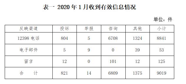一、基本情況 2020年1月,國(guó)家能源局12398熱線共收到有效信息9019件,環(huán)比增加7.13%,同比增加2.08%。 按訴求性質(zhì)分類,投訴821件,占有效信息的9.10%;舉報(bào)14件,占有效信息的0.16%;咨詢6809件,占有效信息的75.50%;表?yè)P(yáng)、求助、建議等其他方面1375件,占有效信息的15.25%。 按反映渠道分類,12398電話8841件,電子郵件53件,留言125件。(2020年1月收到有效信息情況見(jiàn)表一)