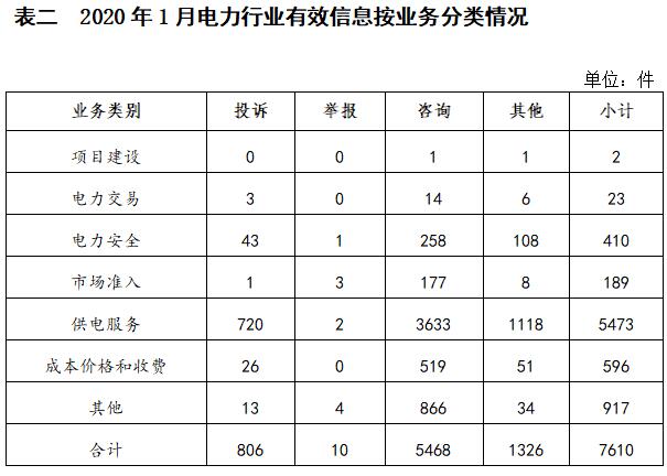 二、分類情況 2020年1月收到的有效信息中: 電力行業(yè)排在首位,有效信息數(shù)量為7610件,占全部有效信息的84.38%;其中受理的投訴舉報(bào)數(shù)量為816件,占全部投訴舉報(bào)數(shù)量的97.72%。群眾反映的問(wèn)題主要集中在供電服務(wù)、電力安全、成本價(jià)格和收費(fèi)等方面。(2020年1月電力行業(yè)有效信息按業(yè)務(wù)分類情況見(jiàn)表二) 新能源和可再生能源行業(yè)排在第二位,有效信息數(shù)量為418件,占全部有效信息的4.63%;其中受理的投訴舉報(bào)數(shù)量為19件,占全部投訴舉報(bào)數(shù)量的2.27%。群眾反映的問(wèn)題主要集中在分布式光伏發(fā)電項(xiàng)目并網(wǎng)驗(yàn)收、上網(wǎng)電費(fèi)和補(bǔ)貼結(jié)算等方面。 石油天然氣行業(yè)排在第三位,有效信息數(shù)量為372件,占全部有效信息的4.12%。有效信息主要集中于咨詢居民燃?xì)獍惭b及收費(fèi)、反映燃?xì)夤收蠁?wèn)題等方面。 其他有效信息合計(jì)614件,占全部有效信息的6.81%。其中涉及煤炭行業(yè)的主要內(nèi)容是咨詢煤炭相關(guān)產(chǎn)業(yè)政策、查詢煤礦項(xiàng)目信息等方面。