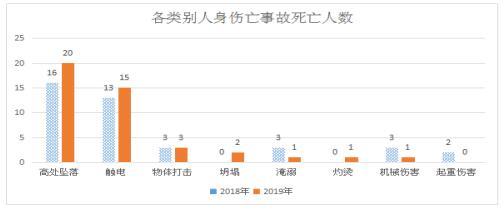 ?。ㄈ┌词鹿暑悇e統(tǒng)計 2019年,觸電造成15起事故15人死亡,高處墜落造成14起事故20人死亡,物體打擊造成3起事故3人死亡,坍塌造成2起事故2人死亡,機(jī)械傷害造成2起事故1人死亡,淹溺、灼燙各造成1起事故1人死亡。其中,觸電和高處墜落類別事故多發(fā),分別占事故總起數(shù)39%和37%,死亡人數(shù)分別占死亡總?cè)藬?shù)35%和47%。