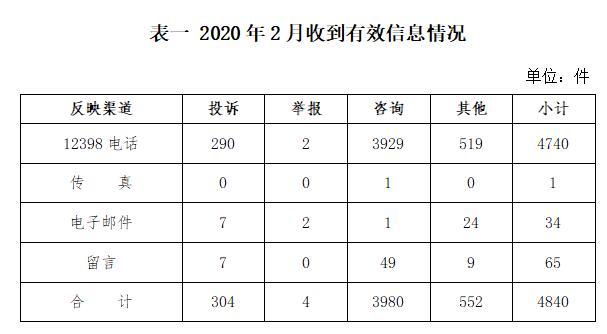 一、基本情況 2020年2月,國家能源局12398熱線共收到有效信息4840件,環(huán)比減少46.34%,同比減少35.21%。 按訴求性質(zhì)分類,投訴304件,占有效信息的6.28%;舉報4件,占有效信息的0.08%;咨詢3980件,占有效信息的82.23%;表揚、求助、建議等其他方面552件,占有效信息的11.40%。 按反映渠道分類,12398電話4740件,傳真1件,電子郵件34件,留言65件。(2020年2月收到有效信息情況見表一)