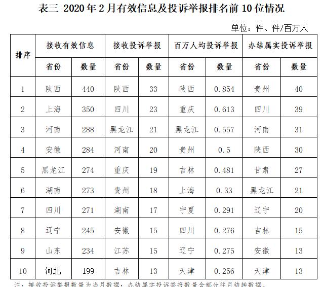 三、分布情況 各?。ㄗ灾螀^(qū)、直轄市)按照收到的有效信息數(shù)量排序,陜西、上海、河南、安徽、黑龍江等列全國前10位;按照投訴舉報數(shù)量排序,陜西、四川、黑龍江、河南、重慶等排在全國前10位;按照百萬人均投訴舉報數(shù)量排序,陜西,重慶,黑龍江,貴州,吉林等排在全國前10位;按照辦結(jié)屬實投訴舉報數(shù)量排序,貴州、四川、河南、陜西、甘肅等排在全國前10位。(2020年2月有效信息及投訴舉報排名前10位情況見表三)
