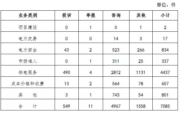 二、分類情況 2020年6月收到的有效信息中: 電力行業(yè)排在首位,有效信息數(shù)量為7085件,占全部有效信息的82.84%;其中受理的投訴舉報數(shù)量431件,占全部投訴舉報數(shù)量的74.70%。群眾反映問題主要集中在供電服務(wù)、電力安全、成本價格和收費(fèi)等方面。(2020年6月電力行業(yè)有效信息按業(yè)務(wù)分類情況見表二) 新能源和可再生能源行業(yè)排在第二位,有效信息數(shù)量為547件,占全部有效信息的6.40%;其中受理的投訴舉報數(shù)量為12件,占全部投訴舉報數(shù)量的2.08%。群眾反映的問題主要集中在分布式光伏發(fā)電項目并網(wǎng)驗收、上網(wǎng)電費(fèi)和補(bǔ)貼結(jié)算等方面。 石油天然氣行業(yè)排在第三位,有效信息數(shù)量為207件,占全部有效信息的2.42%。有效信息主要集中于咨詢居民燃?xì)獍惭b及收費(fèi)、反映燃?xì)夤收蠁栴}等方面。 其他有效信息合計714件,占全部有效信息的8.35%。其中涉及煤炭行業(yè)的主要內(nèi)容是咨詢煤炭相關(guān)產(chǎn)業(yè)政策、查詢煤礦項目信息等方面。