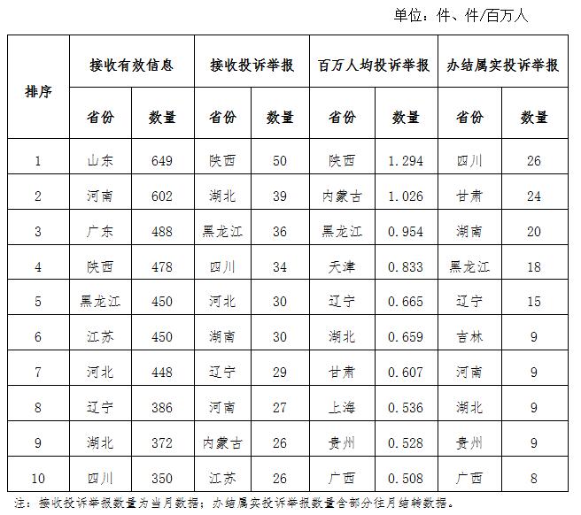 三、分布情況 各省(自治區(qū)、直轄市)按照收到的有效信息數(shù)量排序,山東、河南、廣東、陜西、黑龍江、江蘇、河北、遼寧、湖北、四川等列全國前10位;按照投訴舉報數(shù)量排序,陜西、湖北、黑龍江、四川、河北、湖南、遼寧、河南、內(nèi)蒙古、江蘇等排在全國前10位;按照百萬人均投訴舉報數(shù)量排序,陜西、內(nèi)蒙古、黑龍江、天津、遼寧、湖北、甘肅、上海、貴州、廣西等排在全國前10位;按照辦結(jié)屬實投訴舉報數(shù)量排序,四川、甘肅、湖南、黑龍江、遼寧、吉林、河南、湖北、貴州、廣西等排在全國前10位。(2020年6月有效信息及投訴舉報排名前10位情況見表三) 表三 2020年6月有效信息及投訴舉報排名前10位情況