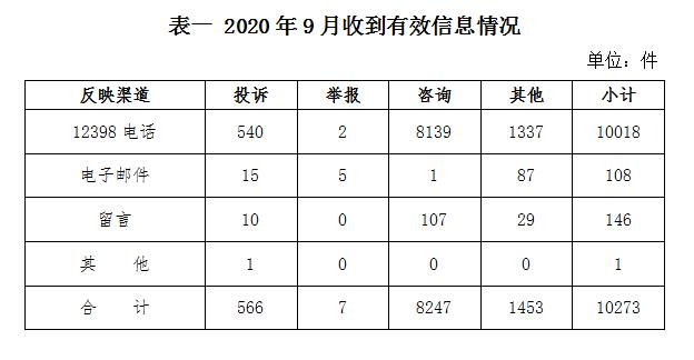 一、基本情況 2020年9月,國家能源局12398熱線共收到有效信息10273件,環(huán)比減少9.93%,同比增加22.62%。 按訴求性質(zhì)分類,投訴566件、占有效信息的5.51%,舉報(bào)7件、占有效信息的0.07%,咨詢8247件、占有效信息的80.28%,表揚(yáng)、求助、建議等其他方面1453件,占有效信息的14.14%。 按反映渠道分類,12398電話10018件,電子郵件108件,留言146件,其他1件。(2020年9月收到有效信息情況見表一)